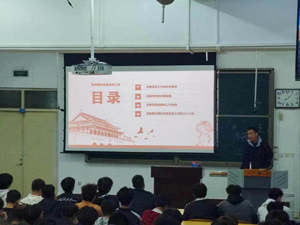 学生党支部书记王思源为新生开展入党启蒙教育。他详细解读了党员发展流程,从递交入党申请书到成为正式党员的各个环节,强调“思想入党”的重要性。通过讲述优秀党员校友在脱贫攻坚、乡村振兴、体育支教等领域的先锋事迹,勉励新生:“党员身份不仅是一份荣誉,更是一份责任。