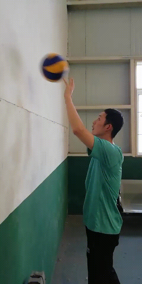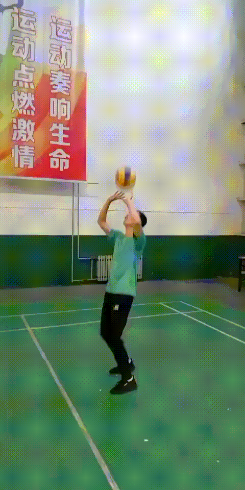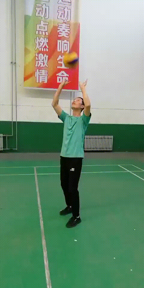 4.击 球:击球点在额前上方一球距离处。有利于看准来球和控制传球方向。