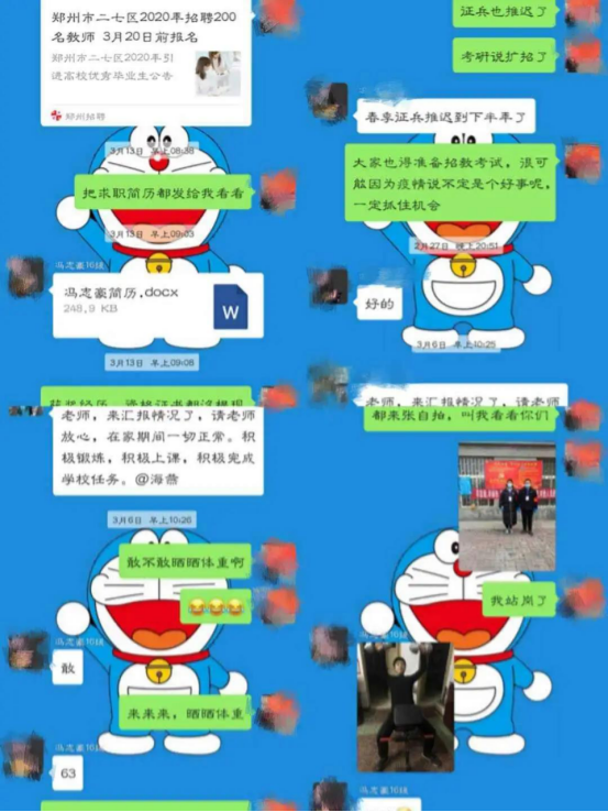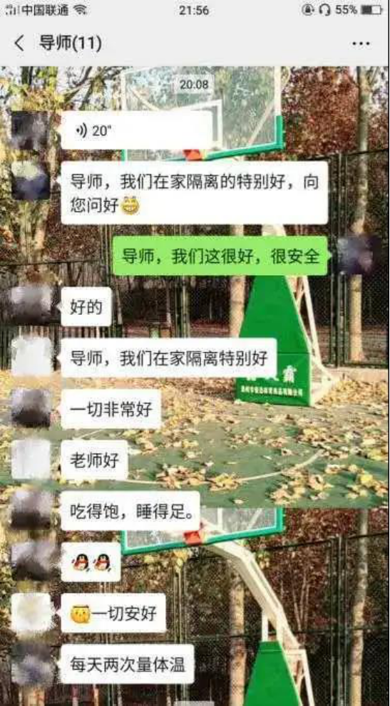 在此次抗击疫情这段期间,2019级导师朱超老师第一时间加入校志愿服务团队,协助统计金穗校区住户信息,保卫学校的安全。实时关注疫情变化,每天时刻关心问候学生的身体健康情况,并定期让学生做出在家健康汇报,关心大家的情绪,并制定相关在家锻炼项目,时时刻刻心系学生。