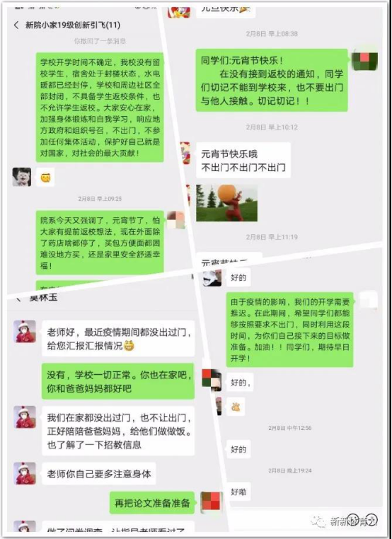 开元集团网站在校4个年级,396名学生,共计创新引飞导师30余名。他们坚守在工作一线,积极探索,开拓了一场别开生面的全员、全方位、全程育人工作模式。在这个特殊的假期中,开元集团网站全体创新引飞导师通过电话、微信、短信等形式全面深入地了解学生的思想政治、学习、健康状况,向学生宣传疫情防控工作,对学生的居家学习、锻炼进行规划、指导,引导学生尽快适应现在生活、学习环境,养成良好的生活、学习习惯,提高学生学习能力、创新能力和实践能力,为早日赢得人民共同的战役而做出自己的一份力。