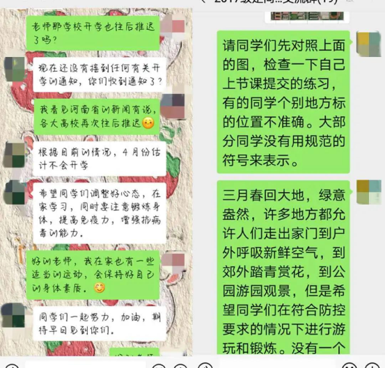 在这段漫长的疫情期间,2017级创新引飞导师吴洋老师,自接到学院领导下发的有关疫情期间学生工作安排的通知后,一直心系学生的安全和配合学院领导开展一系列活动。 在疫情防控以来,吴洋老师还一直通过微信等“云”上平台,时常与学生进行视频通话,一直密切的关心学生安全、安抚学生情绪,用暖心的话语把学生都凝聚在一起,让学生感受到如沐春风的感觉,让学生感知到学校的暖心牵挂和关怀,由此也更加坚定了对祖国抗疫的信心;同时吴老师还加强学生对疫情的理性认识,引导其科学防控疫情,不信谣、不传谣、不恐慌,由此来缓解学生不能外出的焦虑与烦躁,以此为疫情防控奉献自己的一份力量。