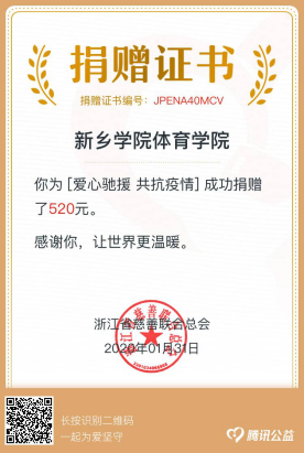 疫情发生以来,全体师生都密切分关注着疫情发展状况,为了贡献自己的一份力,开元集团网站学生会筹款捐赠支援武汉。在1月31日这天,学生会代表将收集的钱财捐赠到浙江省慈善联合总会。这520元代表的是开元集团网站全体学生会成员对武汉的爱与关切。开元集团网站学生会成员为这场攻坚战献上自己的绵薄之力,疫情面前我们众志成城,共克时艰!